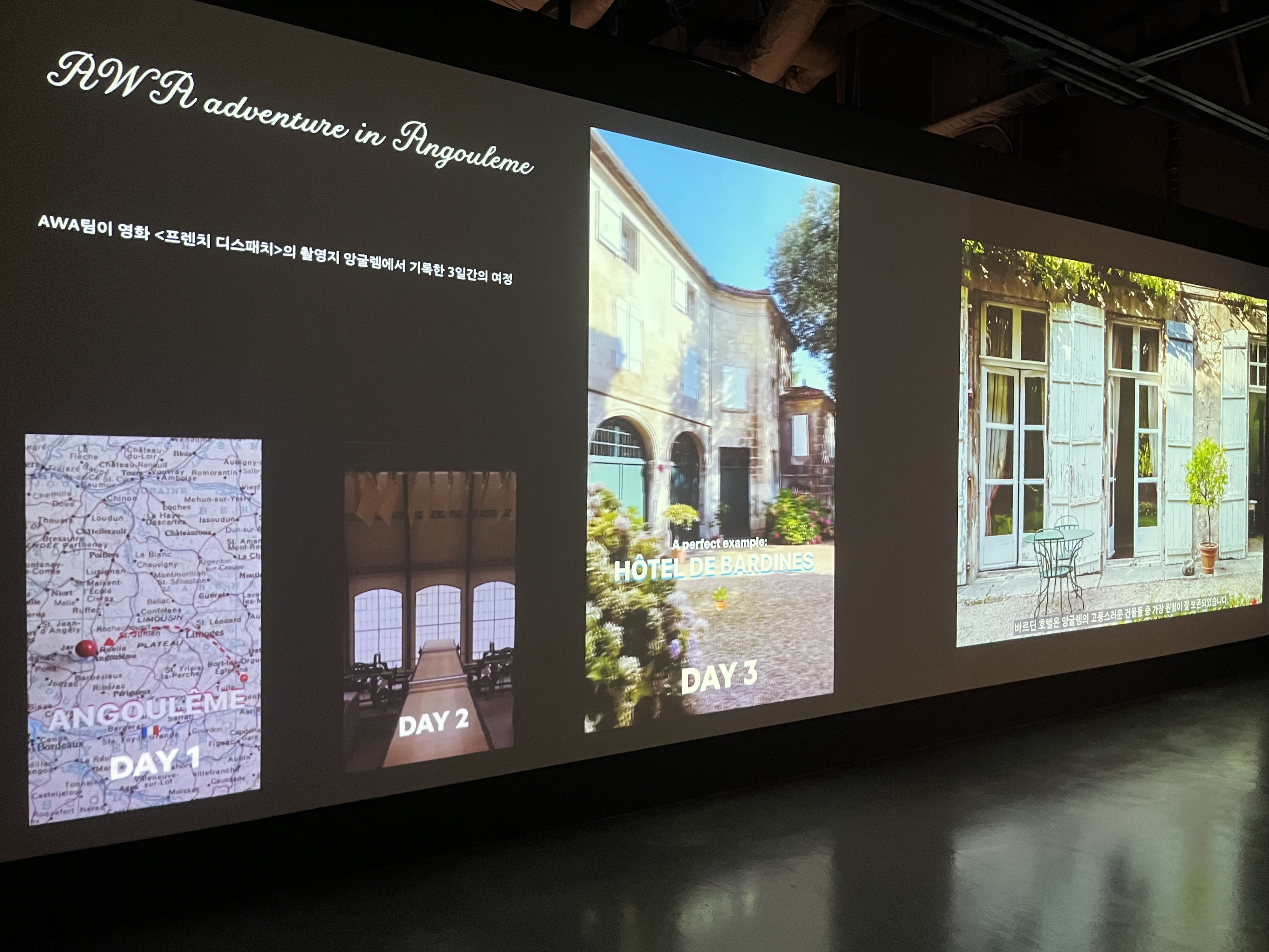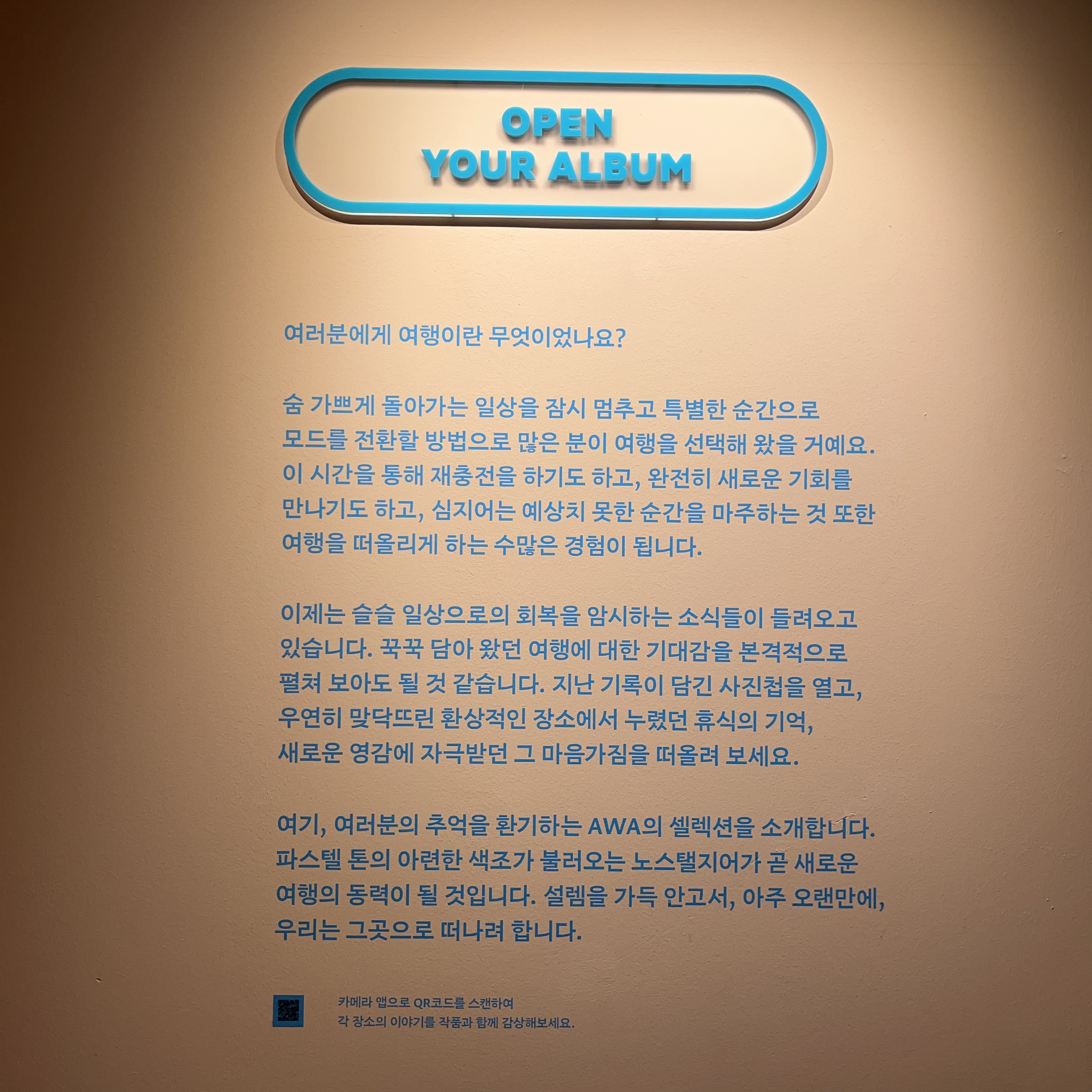 여행에 맞게 출국부터 체크인과 그에 맞는 테마별 컨셉이었다. 작품을 전시하면서 잊히는 순간들을 왼쪽 같은 설명을 통해 '아, 맞아! 나 지금 여행 중이지?' 하면서 상기시켜주고 체크인에 맞게 호텔 로비처럼 꾸며놓은 것과 같은 착실한 컨셉에 '이런 배운 사람들!!' 하며 즐거워하곤 했다.